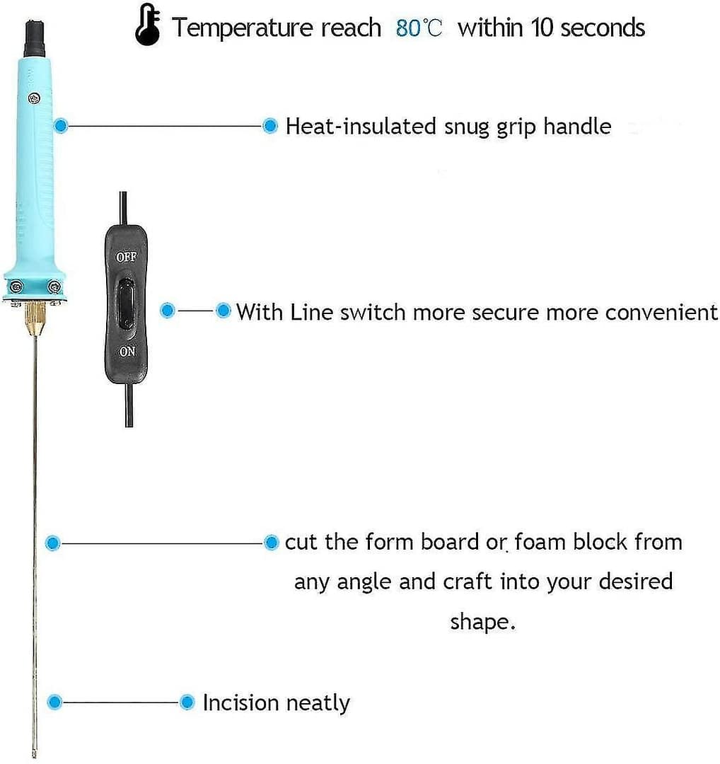 The hot foam cutter is designed to easily cut materials such as styrofoam. Perfect for cutting styrofoam, shaping and writing words on foam. For making art models, exerciseshandmade for students, canopy word makingWith the DIY foam cutter, you can cut styrofoam and other materials much easier. Cut the foam smoothly and quickly, seal the edges neatly and leave no residue.The cutting bar heating tube can only be folded once and cannot be folded repeatedly. Repeating the one-point curve can result in a break.It is suitable for developing commercial graphics, designing complex and small fonts in advertising (such as letters), creating DIY graphics, and even teaching model making to childrenschool.The cutter heats up quickly and is very convenient to use. You can cut the mold board or foam block at any angle you like and mold it into the shape you want. The DIY foam cutter is a great cutting tool that you can use to make your ownShape and enjoy your life.Properties:Material: stainless steel.Heating tube diameter: 2 mm.Power: 15WElectronic adapter:Input: 100-240VOutput: DC 6V 2.5AProperties:1. The hot foam cutter is designed in such a way that materials such as styrofoam can be easily cut.2. For artistic modeling, students practice handcraft exercises and form words.3. You can cut much easier with the styrofoam cutter and other similar materials.4. It is suitable for the development of advertising graphics, the creation of complex and small fonts in advertising (such as letters), the creation of graphic templates by DIY enthusiasts, and even learning model makingChildren to school.5. You can cut the mold board or foam block at any angle you like and give it the shape you want.6. The DIY foam cutter is a great cutting tool to create your design and enjoy your life.7. It can heat up quickly, the tube will reach 80 in 10 seconds. reached 150? if it works.8. The cutting pen can work continuously for no more than 0.5 hours, each can not exceed 2-3 hours.Warning:Please take a break when this cutter is about 45 minutes long.Scope of delivery:1 x Foam Cutting Pen.1 x electronic transformer adapter.